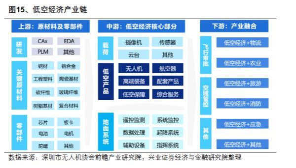 分子材料等,零部件包括芯片、电池、电机等;产业链中游包含无人机、航空器、