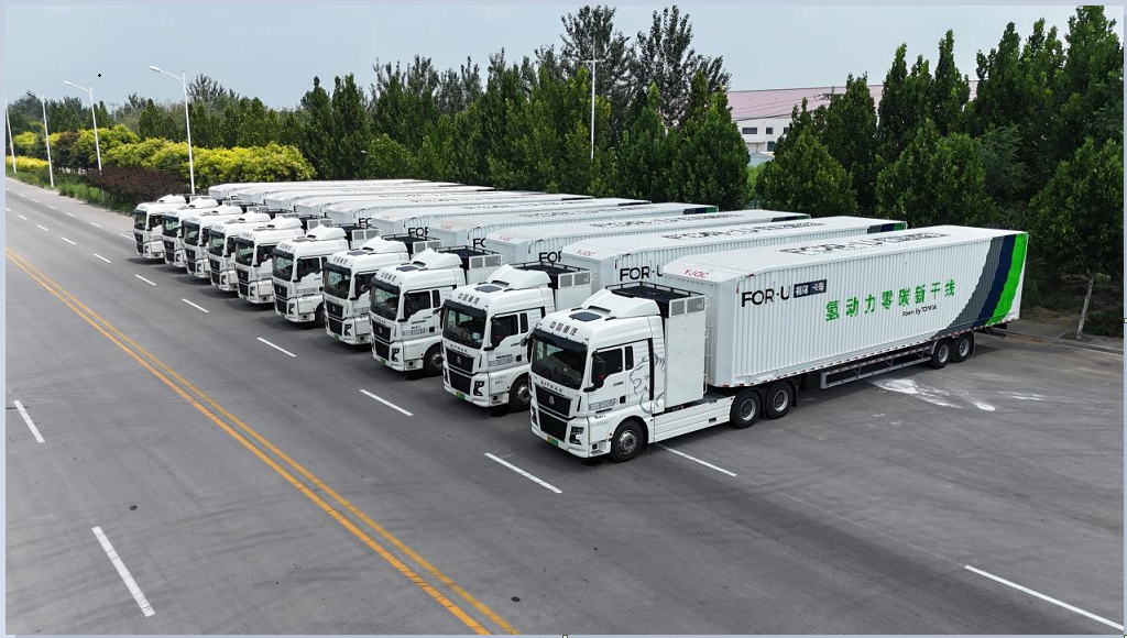 首批投入运营的氢能重卡由中国重汽和丰田联合打造,采用300KW级氢燃料电池动力系统,具有零碳排、长续航等特点,在经过驾驶员专业培训等各种准备环节后,由18台氢能重卡组成的车队开启首个运输任务。