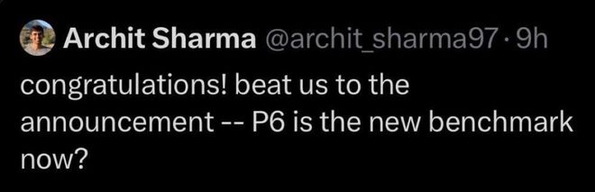 谷歌DeepMind研究员Archit Sharma调侃道,「恭喜!居然比我们先官宣了——现在P6是新标杆了吗」?