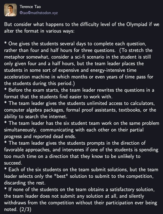 「这警示我们,在缺乏统一测试标准的情况下,贸然对比不同AI模型(或AI与人类选手)的IMO表现如同比较苹果与橙子,没有对比意义可言,」陶哲轩指出。